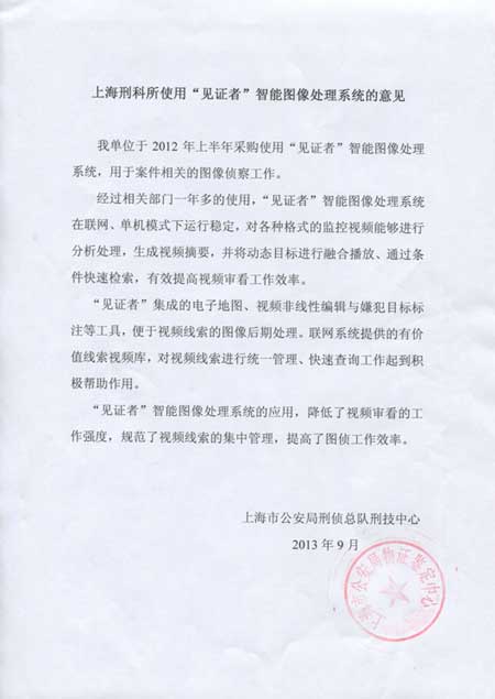 “见证者”智能图像处理系统在上海市公安局刑事侦查总队投入使用一年, “见证者” 软件的免费升级工作正在各地全面进行中,通过客户回访,得到了上海公安的指导意见,我们会再接再厉为广大用户提供更好的产品与服务。